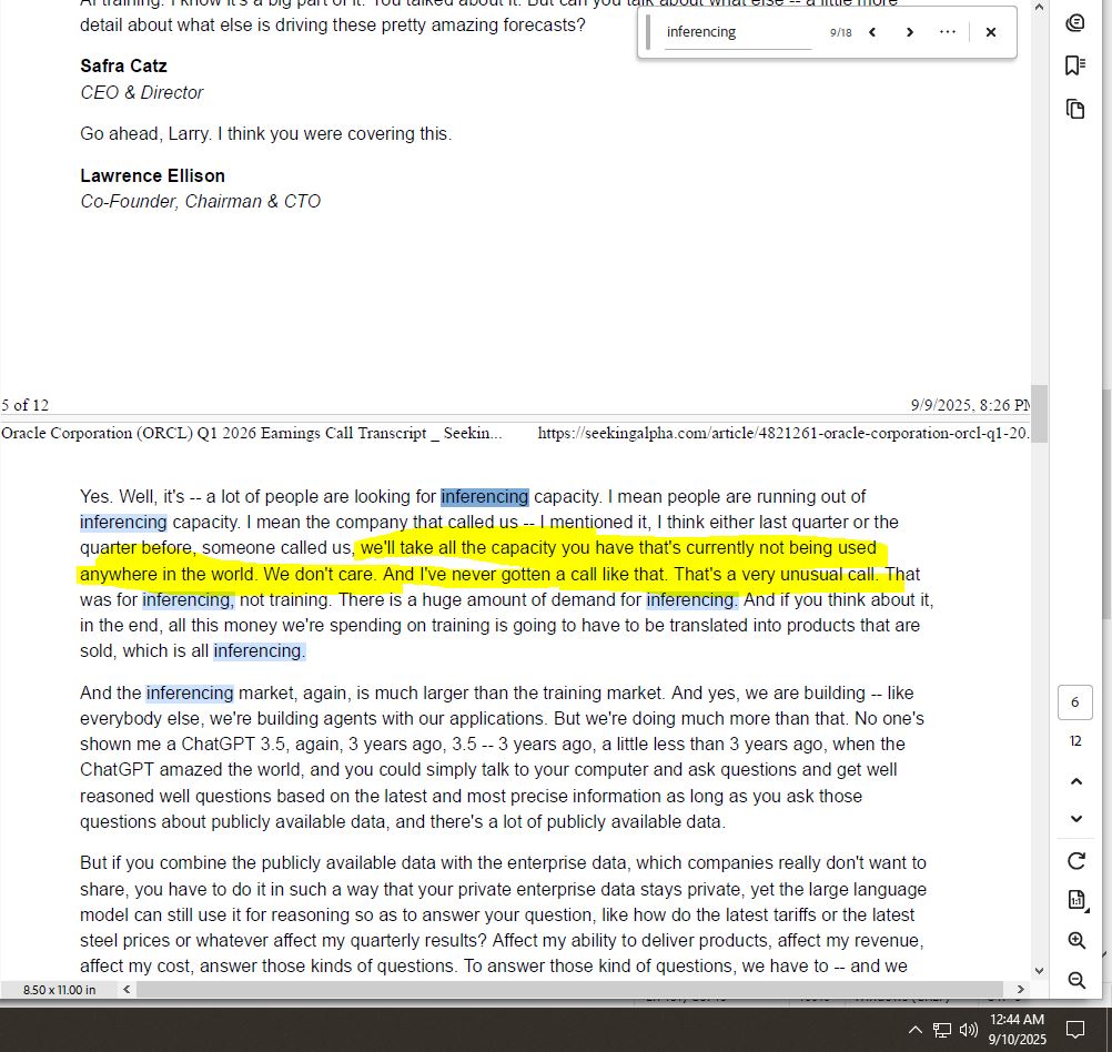 On September 9, 2025, during his opening statements for Oracle's Quarterly Earnings Call, Larry Ellison mentioned the word inferencing